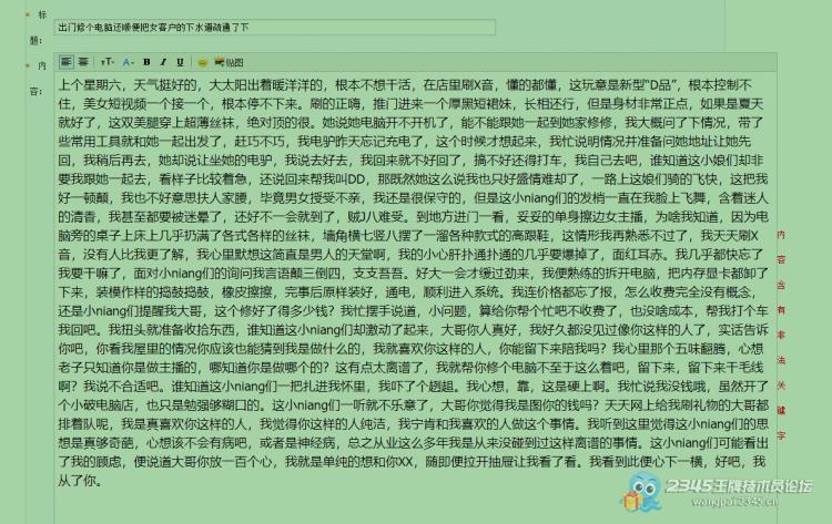 出门修个电脑还顺便把女客户的下水道疏通了下  查看:92 | 回复:5   只看楼主 | 举报 | 收藏