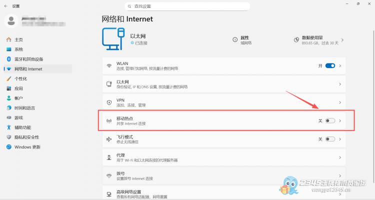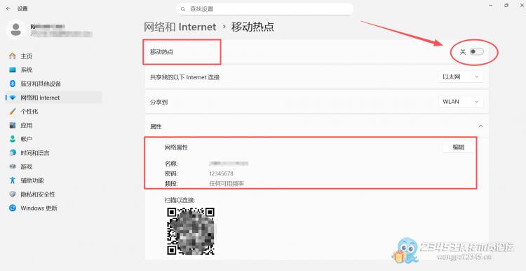 2、选择“网络和internet”,然后点击“移动热点”旁边的箭头。将开关切换至“开启”。您可以通过点击“编辑”来设置自定义名称和密码。确保密码长度至少为8个字符,然后点击“保存”。