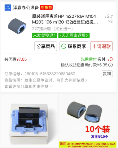 下午不是前两天说要拆道闸退款的物业,她们打印机复印几十份资料的时候卡纸了,她们暴力取纸把搓纸轮干出来了,耳朵已经断了,给她们报价200维修费,马上在拼嘻嘻上拍2个,2.7元一个。