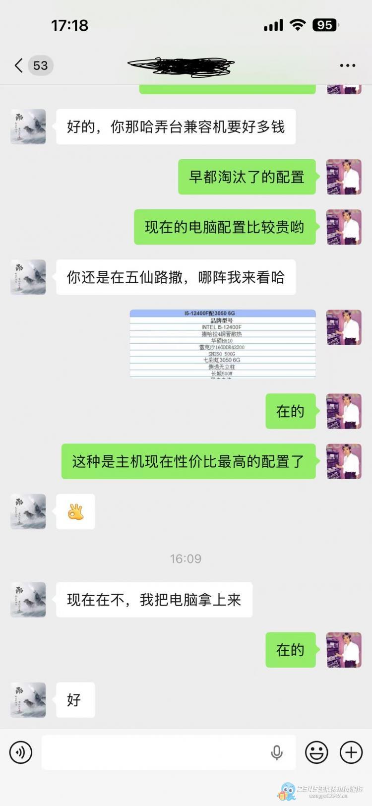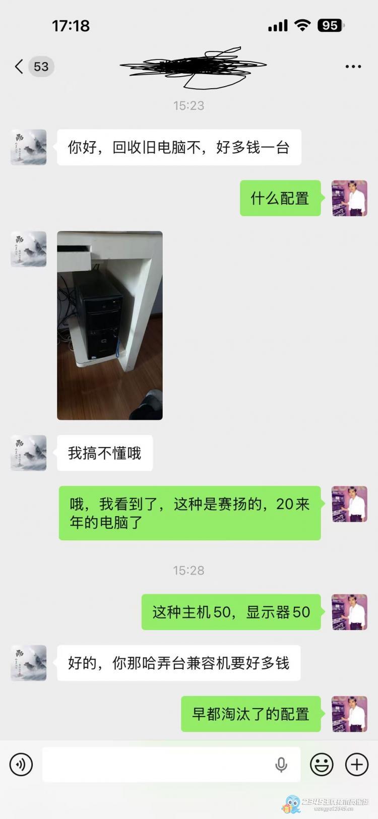 我当时也没多想,就想着以后学校生意还得长期做,主机直接报了50,显示器也给了50。(外面的话我顶多主机20,显示器20了,多报了60)结果他把电脑主机图一发过来,我心瞬间凉了半截,一看就是老掉牙的配置,底下还是奔腾的标。