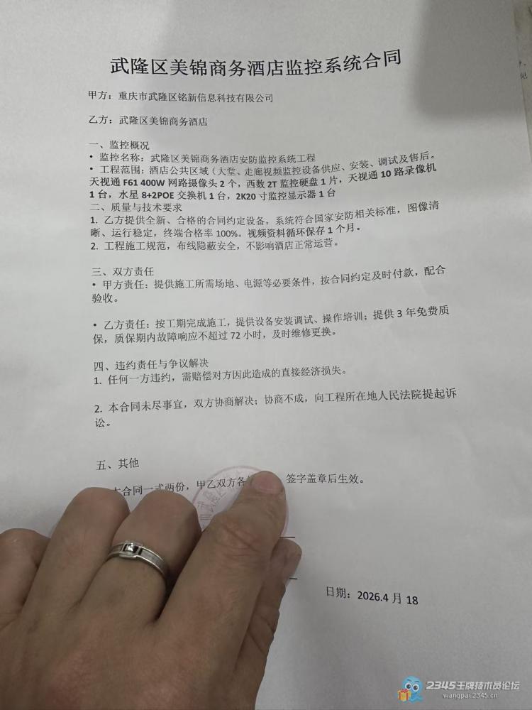 18号不是给一个酒店安装了2路天视通摄像头,和显示器一套3000,这种利润还可以吧,然后今天把合同分享一下给大家,注意这种合同里面尽量不要写金额,因为金额都是先收的全款在发货的,哈哈!